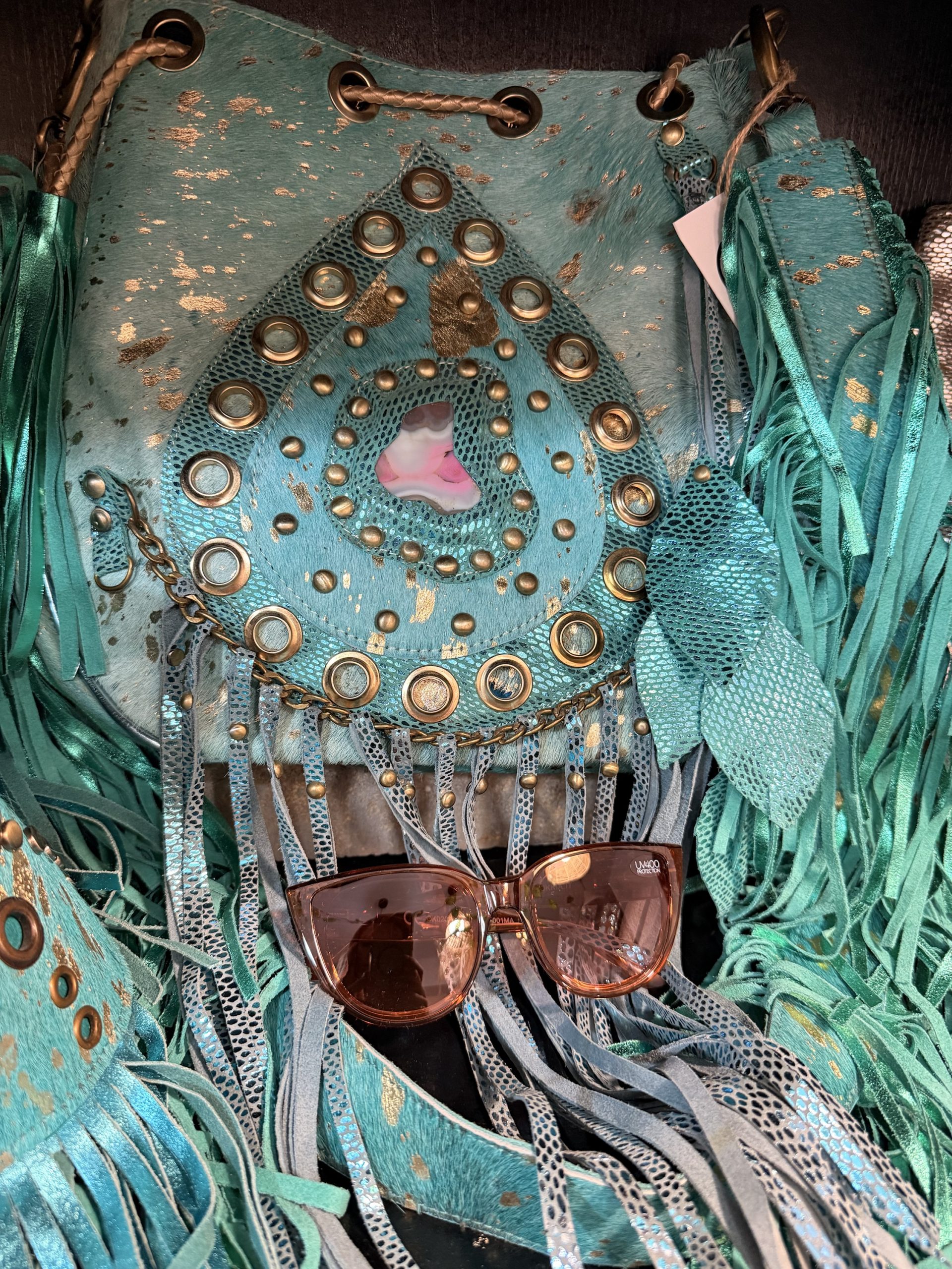 Bolso piel tipo saco en piel turquesa con acabado metalizado, adornado con flecos y una piedra natural en el centro. Un diseño artesanal lleno de carácter boho y toques dorados que elevan cualquier look.
