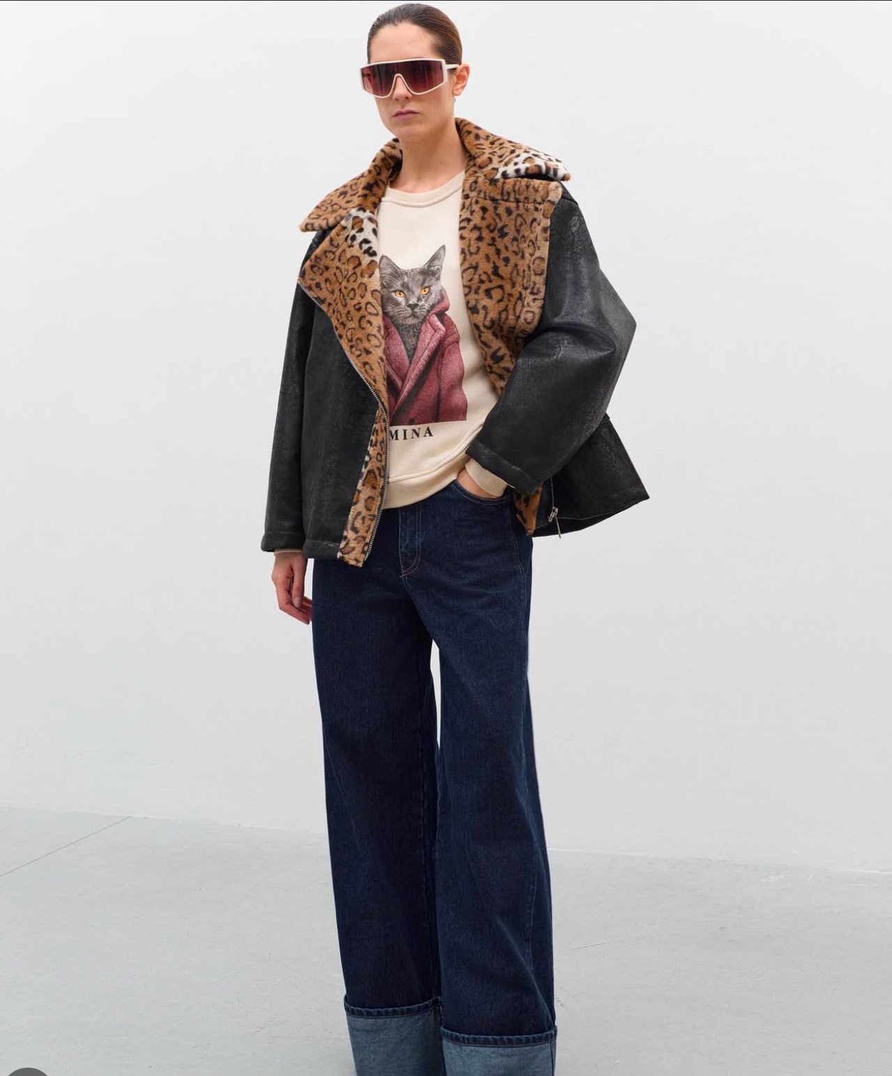 -Chupa oversize con interior y solapa cuello de pelo animal print.