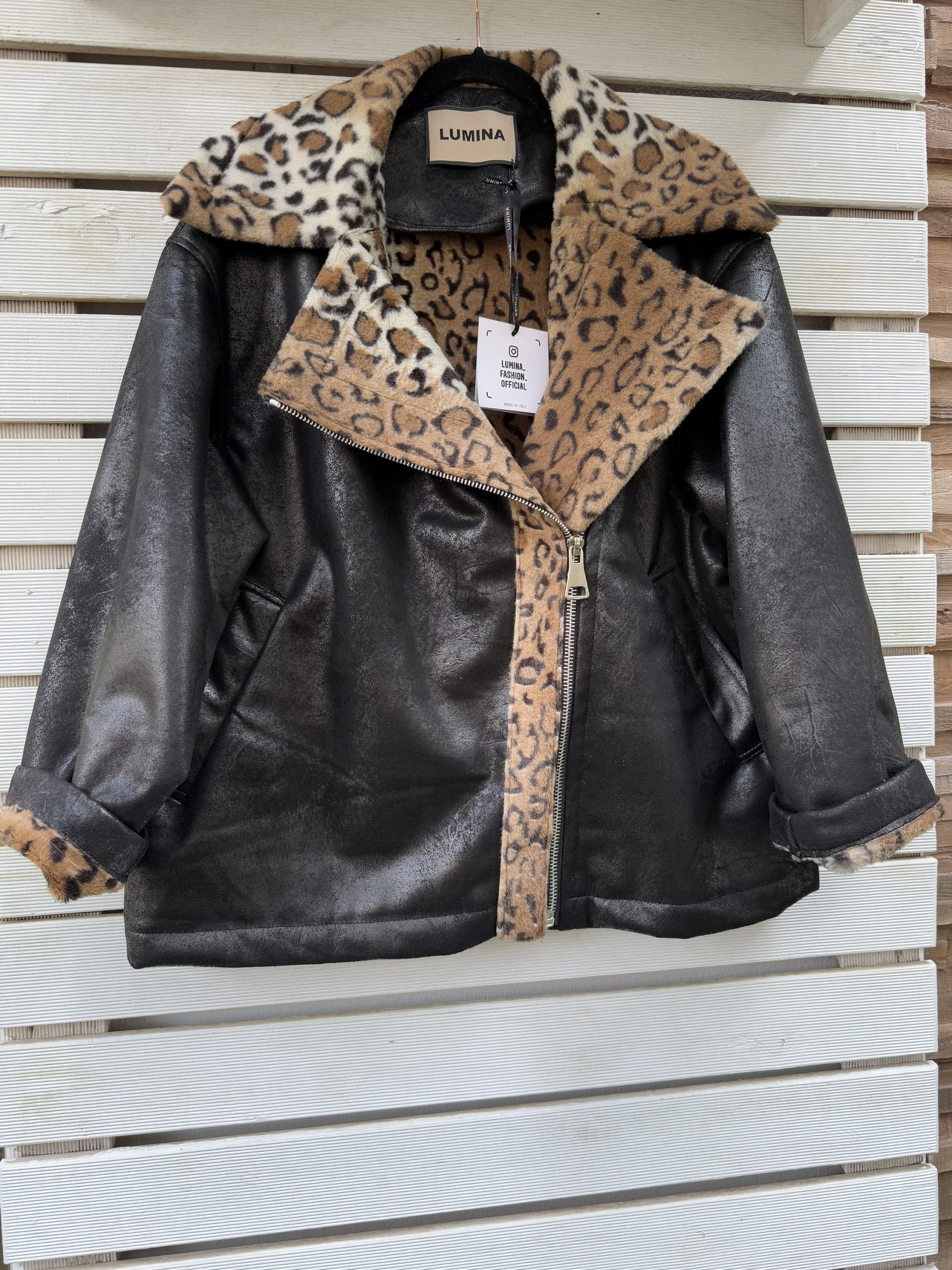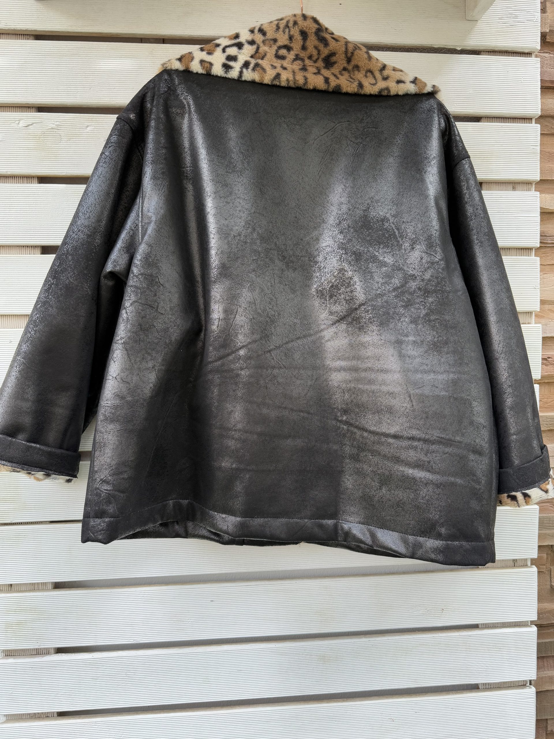 -Chaqueta corta oversize símil piel con pelo en interior y en solapa con estampado leopardo.