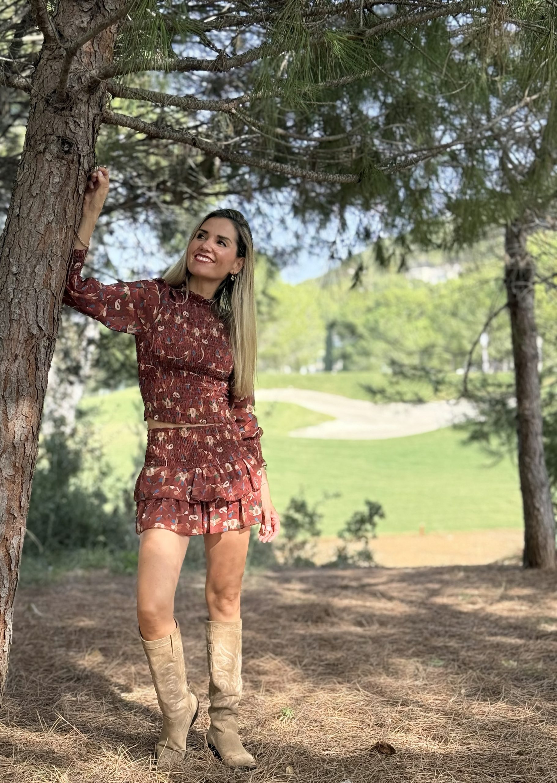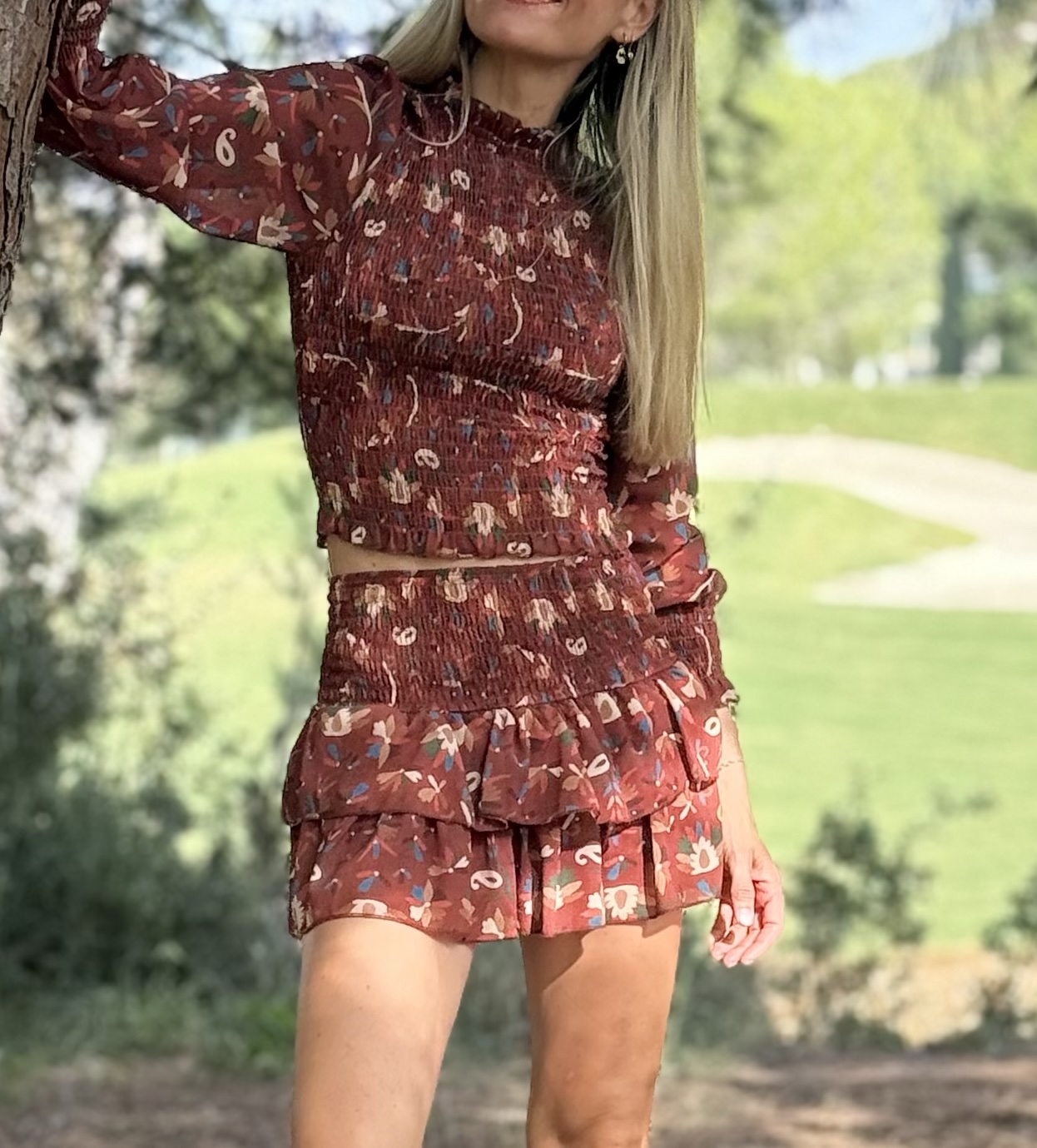 Conjunto compuesto por falda pantalón de volantes y blusa fruncida en cuerpo con nido de abeja y mangas vaporosas, estampado con fondo color tierra
