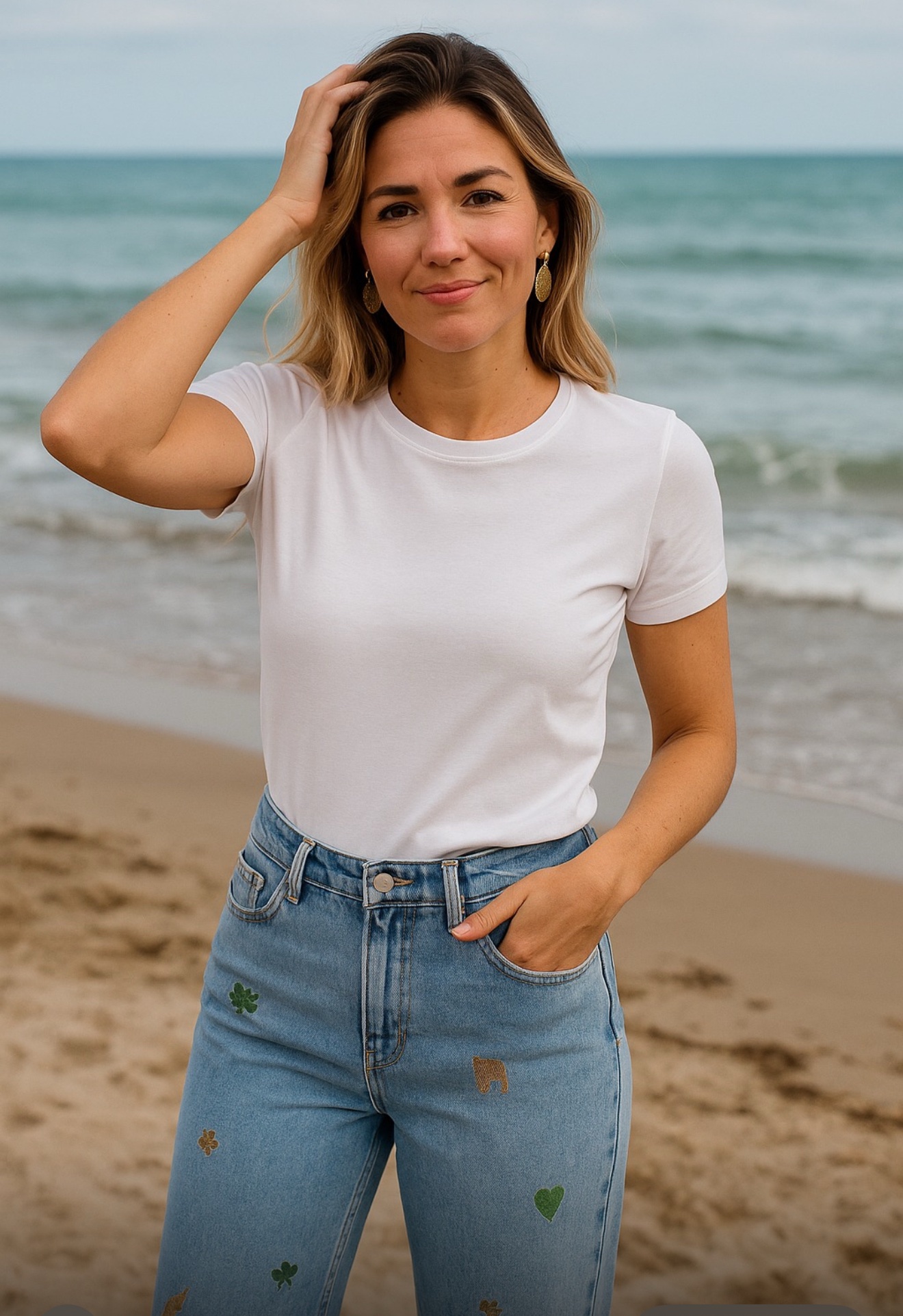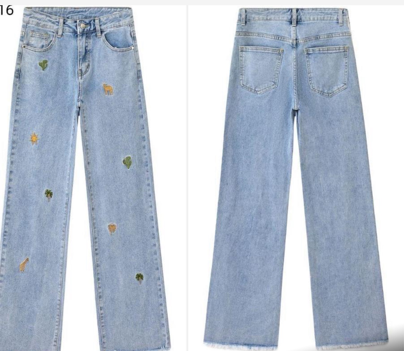 Estos vaqueros de tiro alto en mezclilla azul claro combinan un corte wide leg con un toque creativo gracias a sus delicados bordados de inspiración natural. Diseños como cactus, camellos, soles y jirafas adornan la parte frontal, aportando un aire fresco, juvenil y original a una prenda versátil. Confeccionados en algodón de alta calidad, ofrecen comodidad y estilo para el día a día. Perfectos para quienes buscan destacar con detalles sutiles pero únicos, estos jeans son ideales para combinar con tops básicos o camisas fluidas. La parte trasera lisa equilibra el diseño, manteniendo una estética limpia y atemporal.