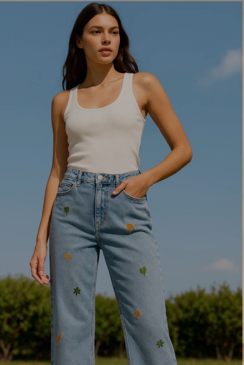 7 de septiembre de 2025Jeans rectos de tiro alto con bordados naturales
