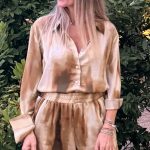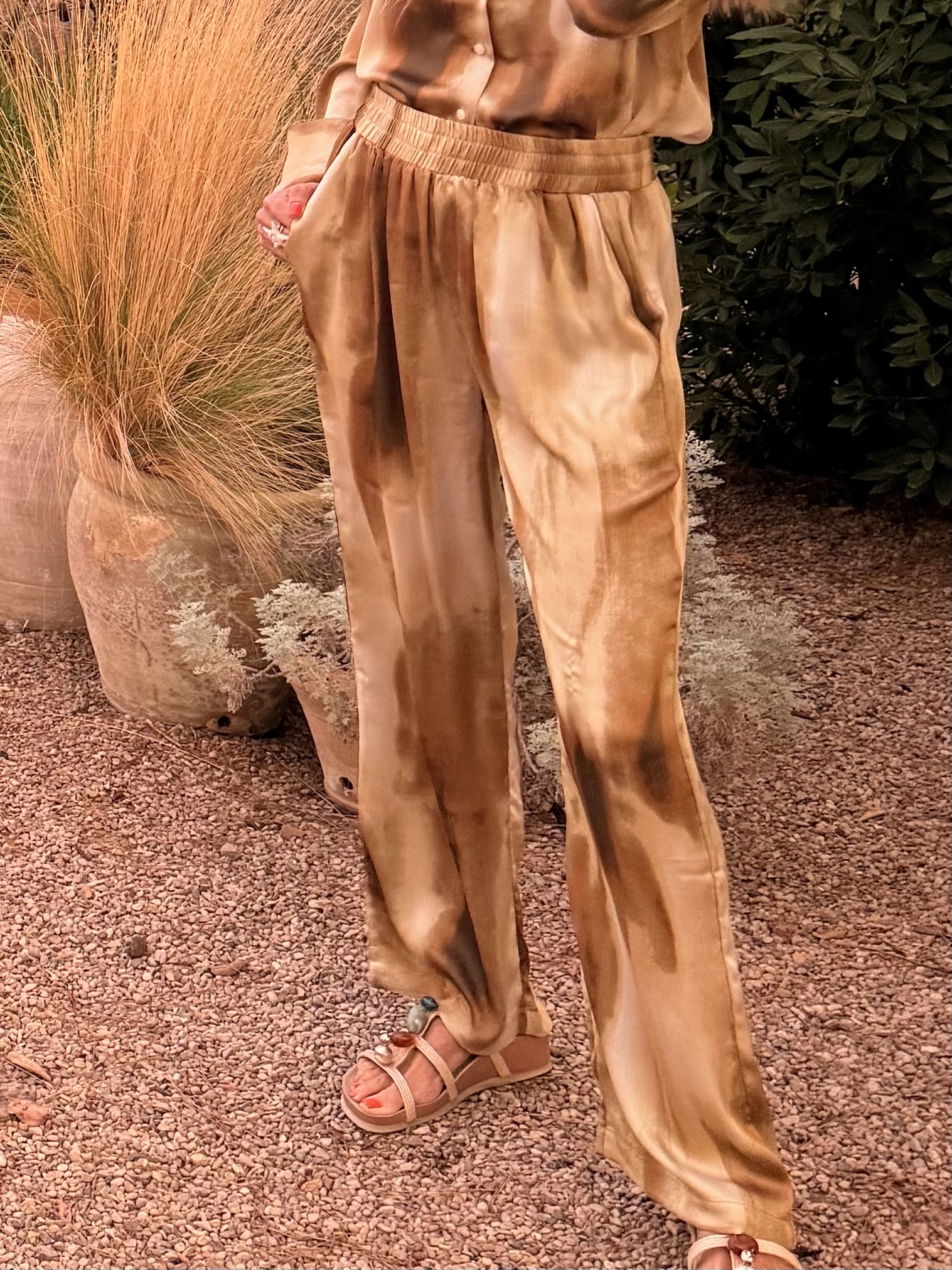 Pantalón satinado de tiro alto con efecto tie dye en tonos tierra. Su tejido fluido aporta movimiento y comodidad, sin renunciar al estilo. Diseño recto con cintura elástica que se adapta perfectamente a la figura. Una pieza versátil que puedes llevar con la blusa a juego para un look coordinado o combinar con tops básicos para un aire más relajado. Ideal para eventos, cenas o paseos al atardecer.