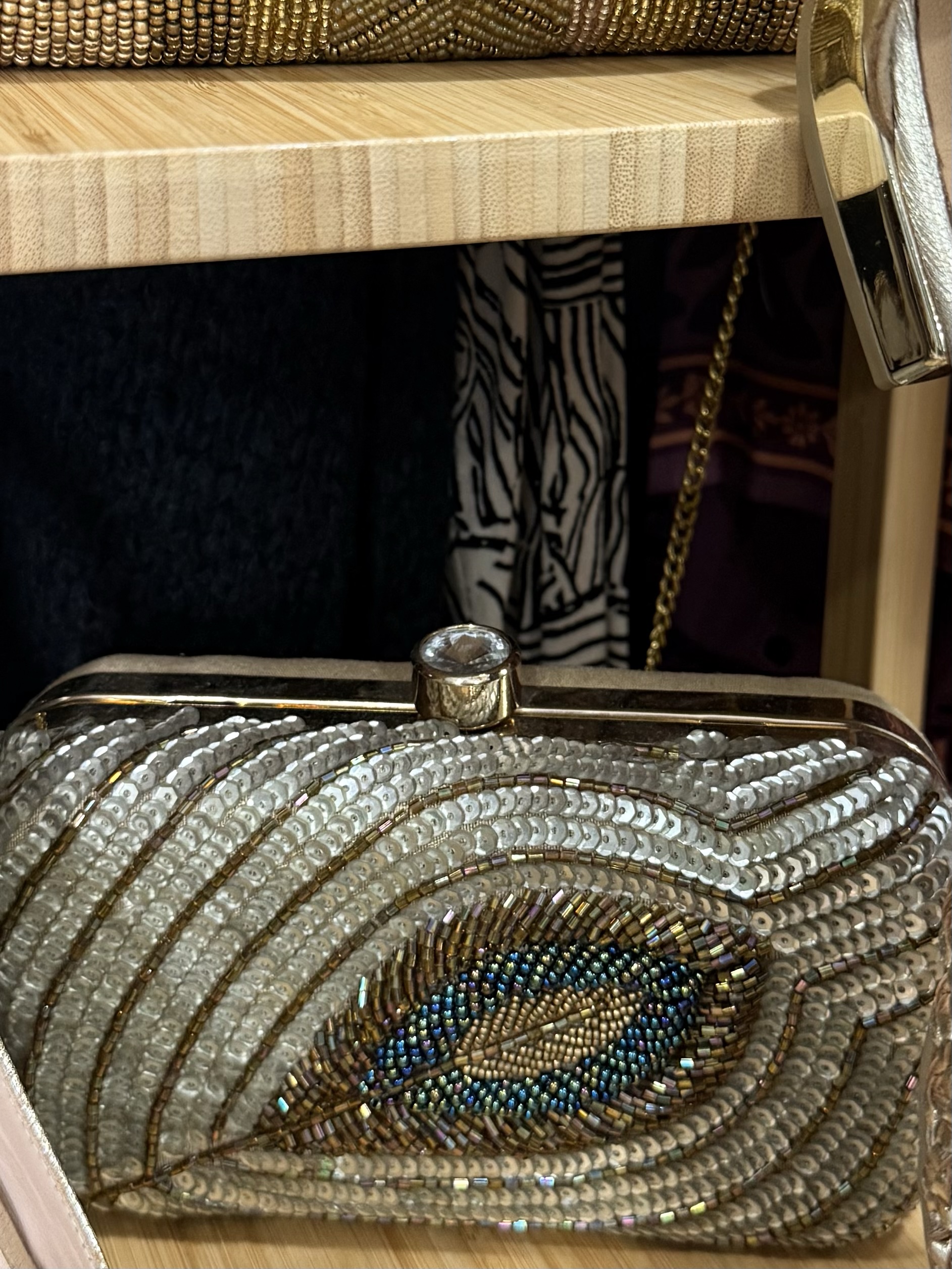 Este clutch es una auténtica joya de mano. Su diseño, meticulosamente bordado con cuentas y lentejuelas, recrea un delicado motivo que evoca las plumas del pavo real, símbolo de belleza y sofisticación. Los tonos dorados, plateados y azul iridiscente se combinan para aportar un brillo sutil pero impactante.